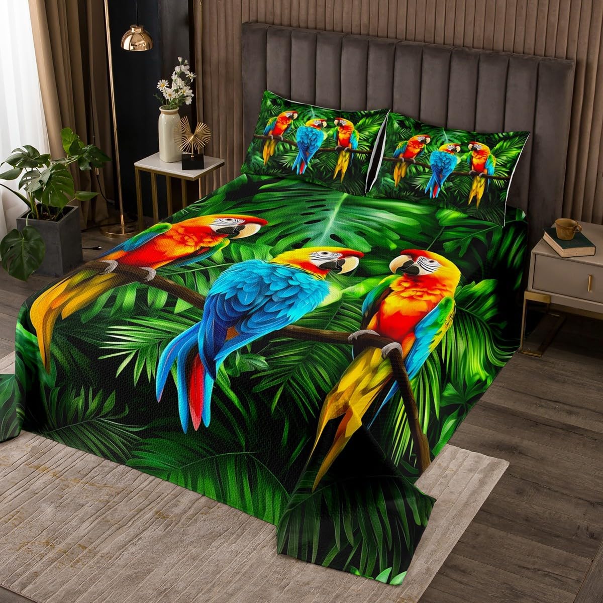 3D Leopard Quilted Queen Size,Cheetah Print Bedspread Tropical Palm Leaves Coverlet Set African Safari Animals Quilt Set Jungle Plant Leaf Weed Decor for Bedroom