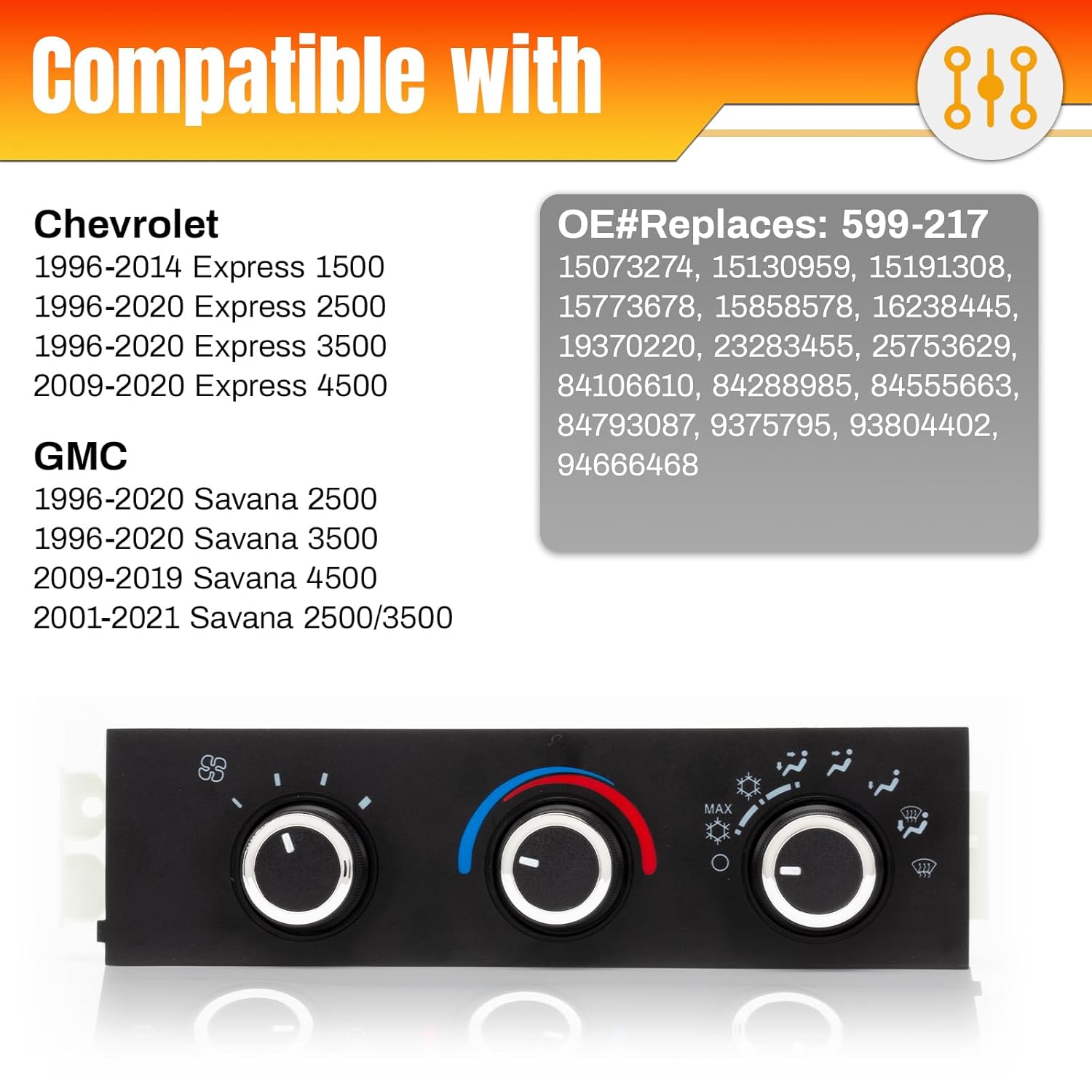 OE#Replaces:599-294 15773679 15858577 15858579 19417516 19417641 22738890.Vehicle Model Fit:Compatible with 2008-2014 Chevrolet Express 1500Compatible with 2008-2022 Chevrolet Express 2500/3500Compatible with 2009-2021 Chevrolet Express 4500Compatible with 2009-2023 Chevrolet Express CargoCompatible with 2009-2023 Chevrolet Express PasajerosCompatible with 2008-2022 Chevrolet Express 3500Compatible with 2008-2014 GMC Savana 1500Compatible with 2008-2022 GMC Savana 2500/3500Compatible with 2009-2021 GMC Savana 4500Ideal Replacement:This air conditioner heater climate control module has unique software that is automatically configured to the vehicle as soon as it is plugged in and installed, eliminating the need for manual setup.Made with high-quality materials that meet the standards of original equipment. Our products are designed to replace your original equipment, providing the same functionality and appearance as the factory module.Quality Assurance:VODCACA is committed to producing high quality products and providing customers with a good shopping experience. if you encounter any quality problems during use, please feel free to consult us via Amazon mail. We will get back to you as soon as possible and provide you with a satisfactory solution.