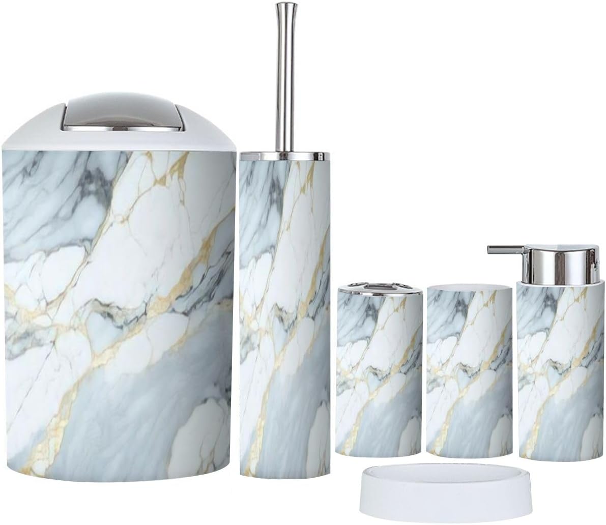 - Lotion DispenserIt can be pressed by one hand and rebound automatically. Use our soap dispenser for liquid hand soap, dish soap, lotion, shampoo, body wash, massage oils, etc.- Toothbrush Cup- Toothbrush HolderFits most sizes of toothbrushes, toothpaste, etc.- Trash CanWith swing lid, it's convenient for using.- Toilet Brush HolderHide the brush head inside the base- Soap DishIt can leak and keep dry.Please Note:1. Please allow tiny size difference for manual measurement.2. Please confirm the size before purchase.