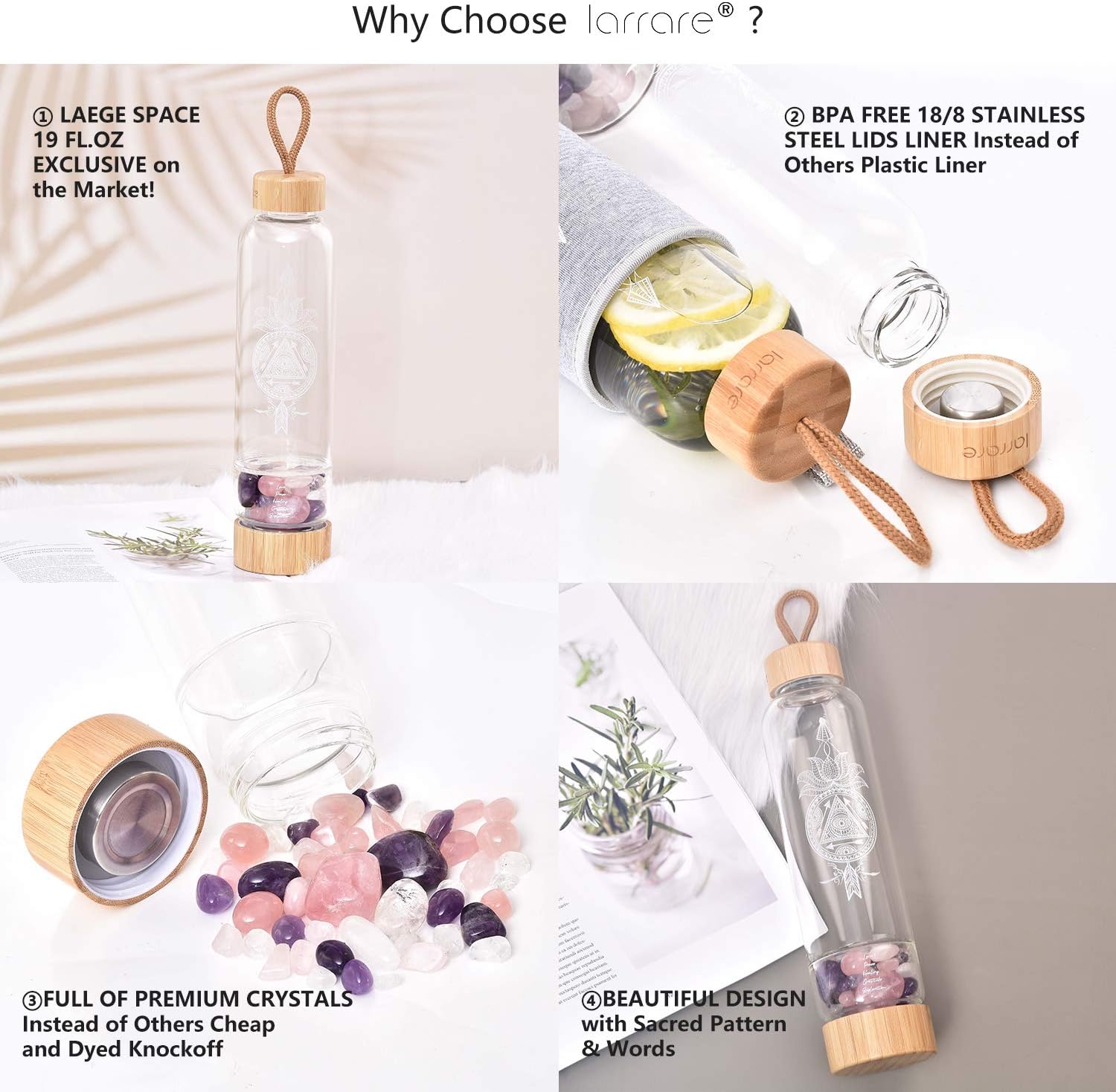 Why Choose from Larrare?- Sipping from a crystal water bottle is trendy by nature - How could a glass bottle with crystals inside not be kind to the eyes? Beyond aesthetics, these gem-filled vessels have myriad benefits, like healing properties, rejuvenation, support for the body, spirit, mind, help decreased pain, anger, anxiety.- Printed with a sacred design (boho lotus flower with the third eye (mind's eye) dream catcher). A consistent visual reminder & awakening of the intention behind the pattern and crystals. Crystal Healing Properties:Amethyst: Exact kind of relaxing energy we could use in a long day, soothe away the stresses that keep you up at night.Rose Quartz: Open up your heart chakra to every kind of love and attracts love.Clear Quartz: Cleanse, activate, align all of the chakras. Extremely powerful and amplifies any energy or intention. How to Use?- Gently fill in our hand-selected crystals into the gem pod, plug it with the silicone stopper, then place the gem pod into the lid and easily screw on the bottle. Or if you want the crystals in direct contact with water, you'll don't have to use the silicone plug. - Fill up with fresh water and drink away. The crystals under transfer power into your water throughout the day you won't be able to ignore it so you would probably drink more while valuing each drop.Getting the benefits from the Larrare crystal water bottles that help keep your body and mind hydrated for living a healthy lifestyle. Bring this eye-catching positivity into your life, take it to meditation, yoga, pilates, office, home, or anywhere you go.