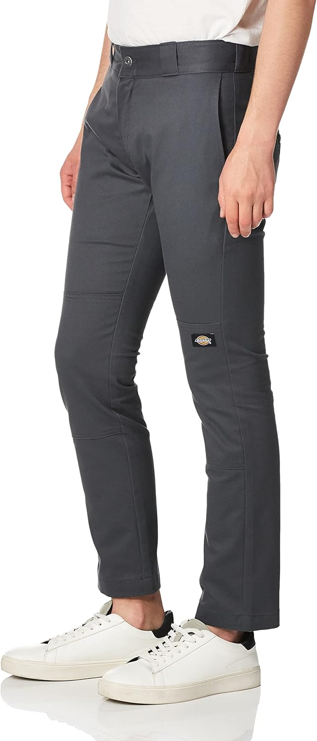 Double knee work pant is skinny through the seat, thigh and leg. sits below the waist. with 1% spandex stretch for greater movement.