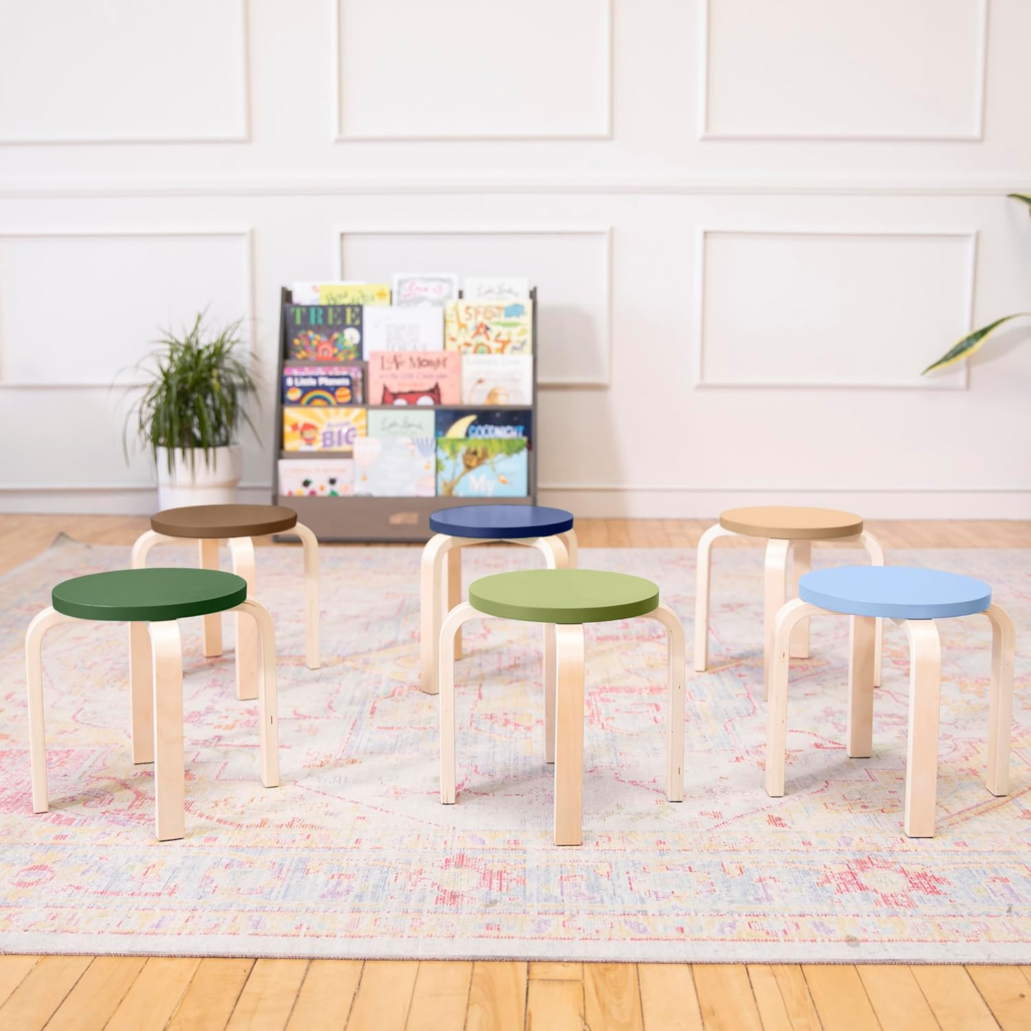 This 6-piece set of Bentwood Stools with curved wood is great for circling up or placing around an activity table to enjoy crafts, story time, or snacks. Build engaging educational spaces to promote confidence and independence with child-sized furniture. Backless stools with round tops allow students to quickly and easily pair up or work in small groups. Wooden stools feature a 12" seat height that complements tables 18-22" high. These children's seats neatly stack to save space or slide under your table for a smaller footprint. The lightweight design makes it easy to move around the room for a flexible seating option, which supports a child's need for autonomy and independence. Stools feature a smooth finish, rounded edges for safety, and felt glides to help prevent floors from scratching and reduce noise. Constructed from birch plywood that is molded into shape creating a solid natural hardwood. A durable finish seals the surface and resists scratching. A UV inhibitor makes furniture resistant to ultraviolet light and yellowing. Natural birch plywood is extremely durable and will hold up to everyday use in daycares and preschools, great for the home.