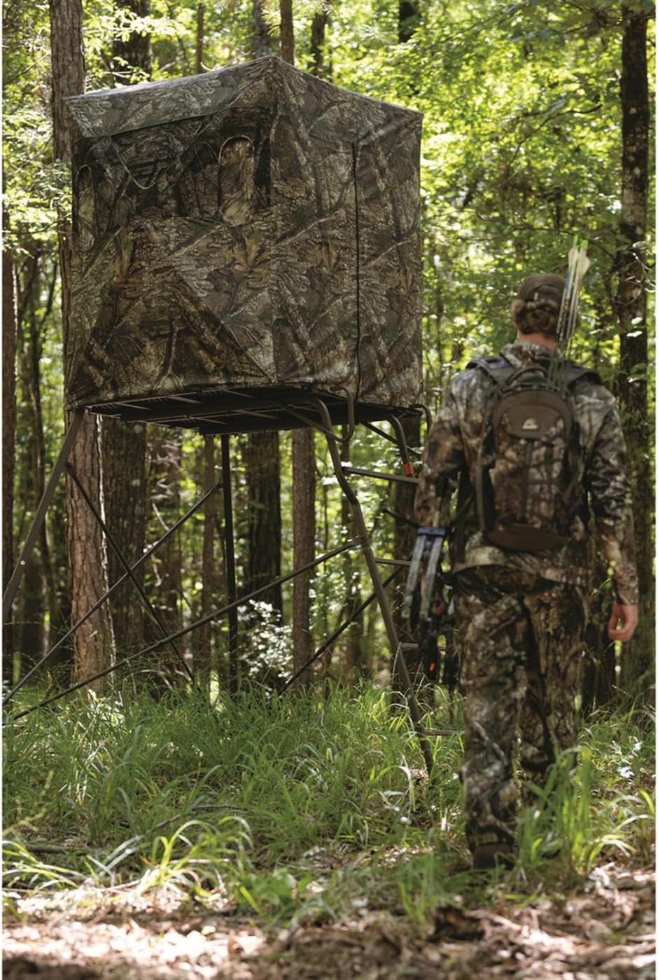 Guide Gear 4x4 6' Tripod Tower and Blind Guide Gear tripod tower for hunting offers a good field of view and allows you to see everything, for easy and comfortable targeting without revealing your hiding spot. This climbing hunting stand is a two-man stand for hunting that comfortably supports up to 500 lbs. Hunting equipment that makes a great addition to your hunting gear. Hunt Discreetly The hunting tower with ladder has a durable steel construction. A 6' height offers visibility and elevation during your hunt. It features a 4' x 4' platform that is big enough for 2 hunters. A comfortable way to get elevated during your hunt. 26" height from platform to shooting rail The blind hunting tower has a zippered door for easy access. Key Features: Water-resistant 210D polyester shell LookOut 1-way mesh lets you see everything outside, while game can't see anything inside Plenty of windows for lining up your shot Black PU-coated fabric interior eliminates scent, shine, and noise Triangle zippered door for easy access Adjustable ladder for easy in/out Height to Platform: 6' Platform Dimensions: 48" x 48" Blind Dimensions: 48"l. x 48"w. x 64"h. Weight Capacity: 500 lbs.