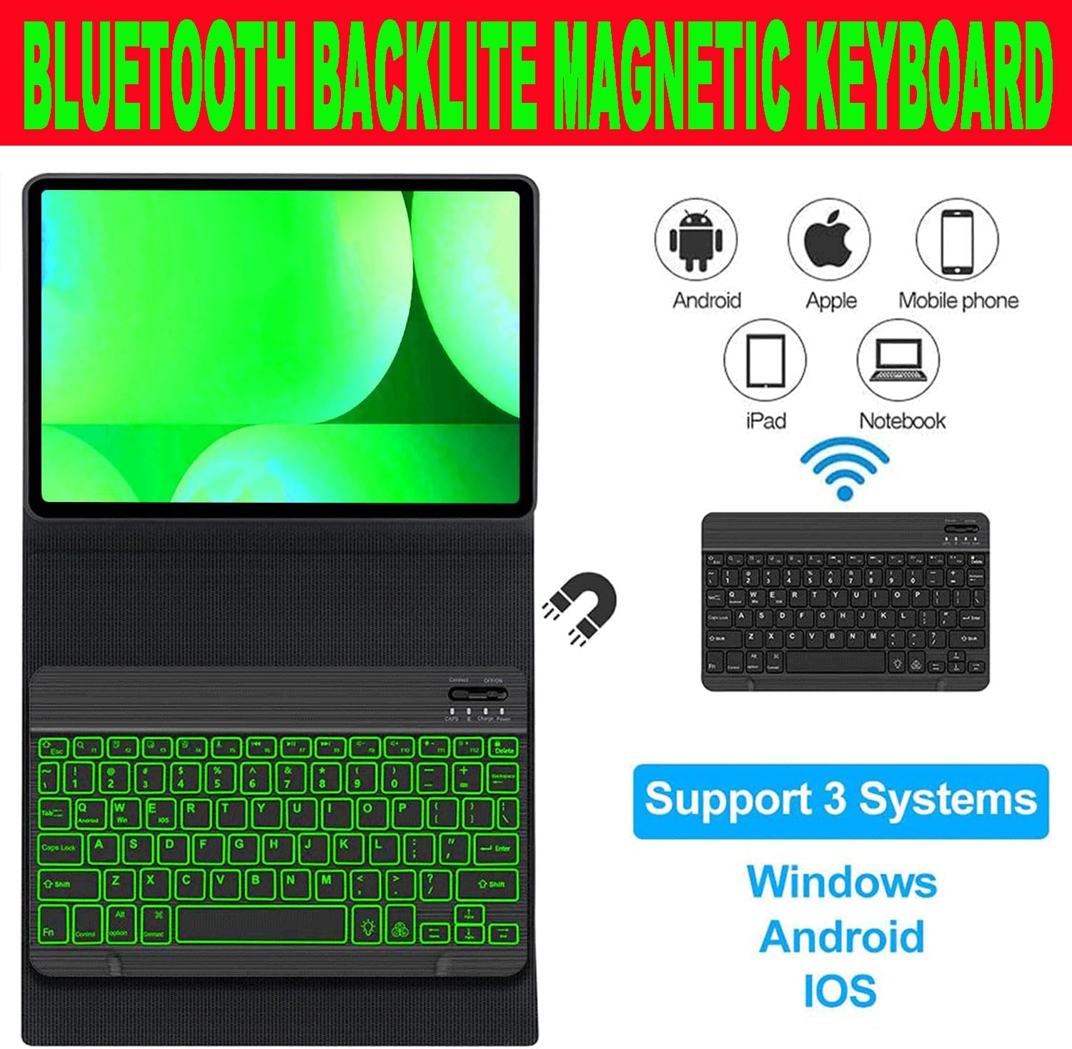 How to connect the Bluetooth keyboard?1. Open the case, and insert the tablet into the case.2. Dial ON/OFF button on right direction for opening keyboard, press ” FN+C” into wireless matching condition.(The Bluetooth light blinks slowly)3. Open bluetooth on device, search keyboard name(Bluetooth Keyboard 3.0) for matching device to keyboard4. Click the "Bluetooth Keyboard 3.0" to connect, finish.Features:1. Magnetic removeable keyboard2. Converts from to stand3. Stylish PU leather Covering/ case4. With front and rear-facing canera holesSpecification:1. Battery Capacity: 400mAh(2*200mAh)2. Voltage: 3.7V3. Input Voltage: Micro USB Charge 5V4. Standby Time: >100 Days5. Charging Time: 3-4 Hours6. Working Time with backlit: About 100 hours7. Operating Temperature: -20℃-55℃8. Storage Temperature: -40℃-70℃9. Working Distance: 10M11. Modulation System: GFSKPackage Included:1*bluetooth Keyboard with Case1*Micro USB Charging Cable1*User ManualKind Tips: 1. The keyboard will automatically sleep if you do not use it within 10 minute. 2. Then press any key and wait 2-3 seconds, the device will automatic return the last time you read.