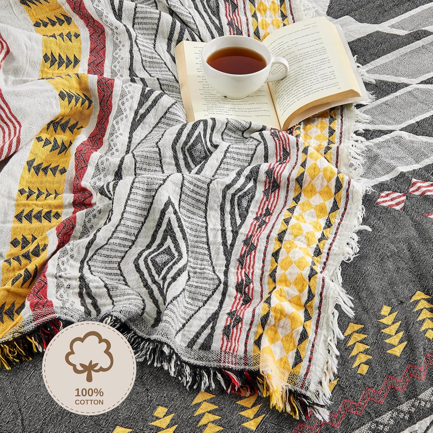 King Size Bedspread- King Size Comforter, Lightweight Blanket Bedding, Turkish Cotton Comforter | King Size (95x105) Boho Natural Coverlet (Suri Yellow)