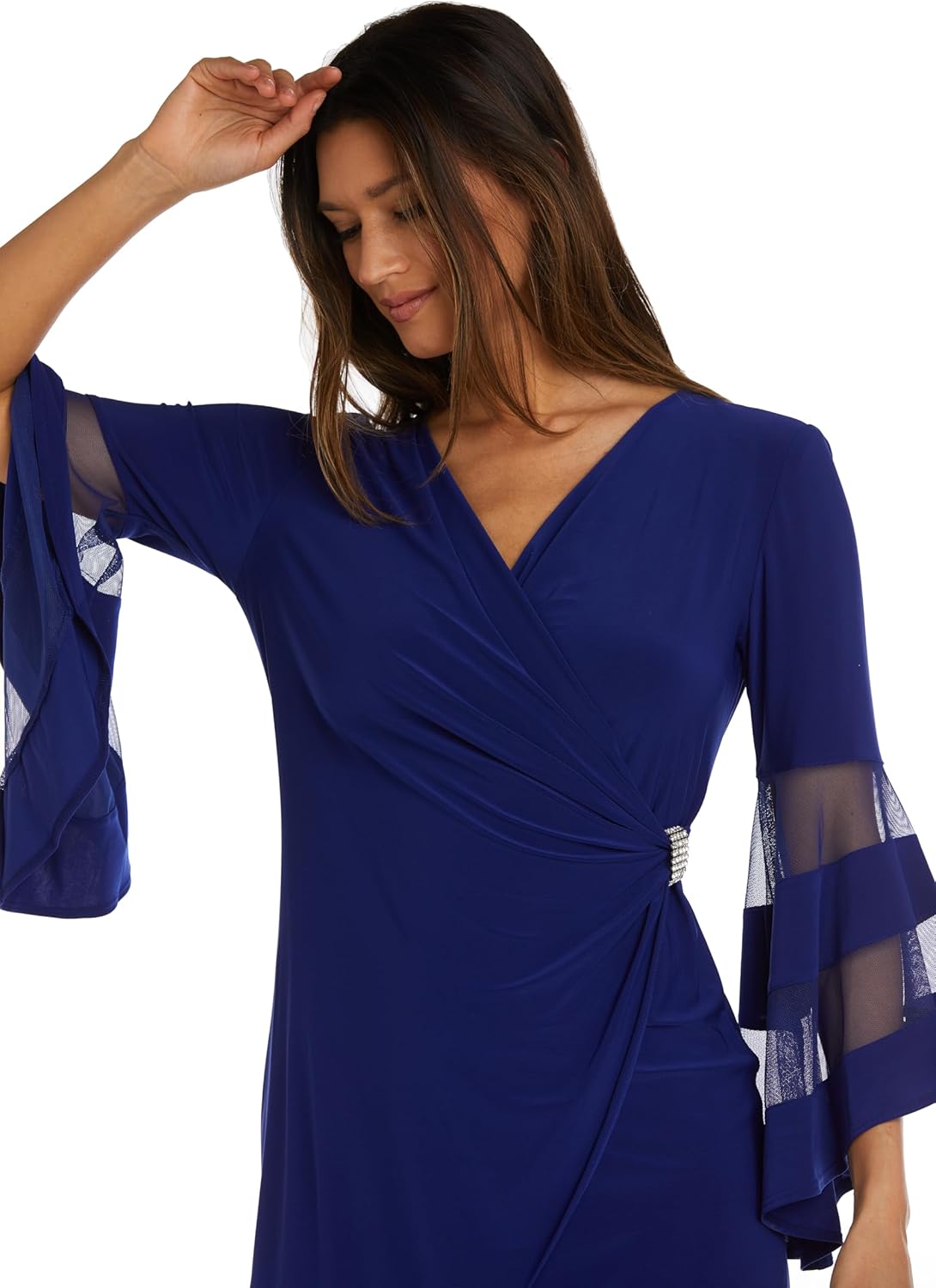 Turn heads in this radiant wrap dress from R&M Richards Collection., designed to make an entrance at any special occasion. This wrap-style dress features ethereal sheer-trimmed angel sleeves that float with every movement. A flattering silhouette cinches at the waist and highlights your curves, while a shimmering rhinestone accent at the side adds just the right amount of sparkle. Perfect for weddings, evening events of formal gatherings, this dress combines timeless elegance with modern charm.