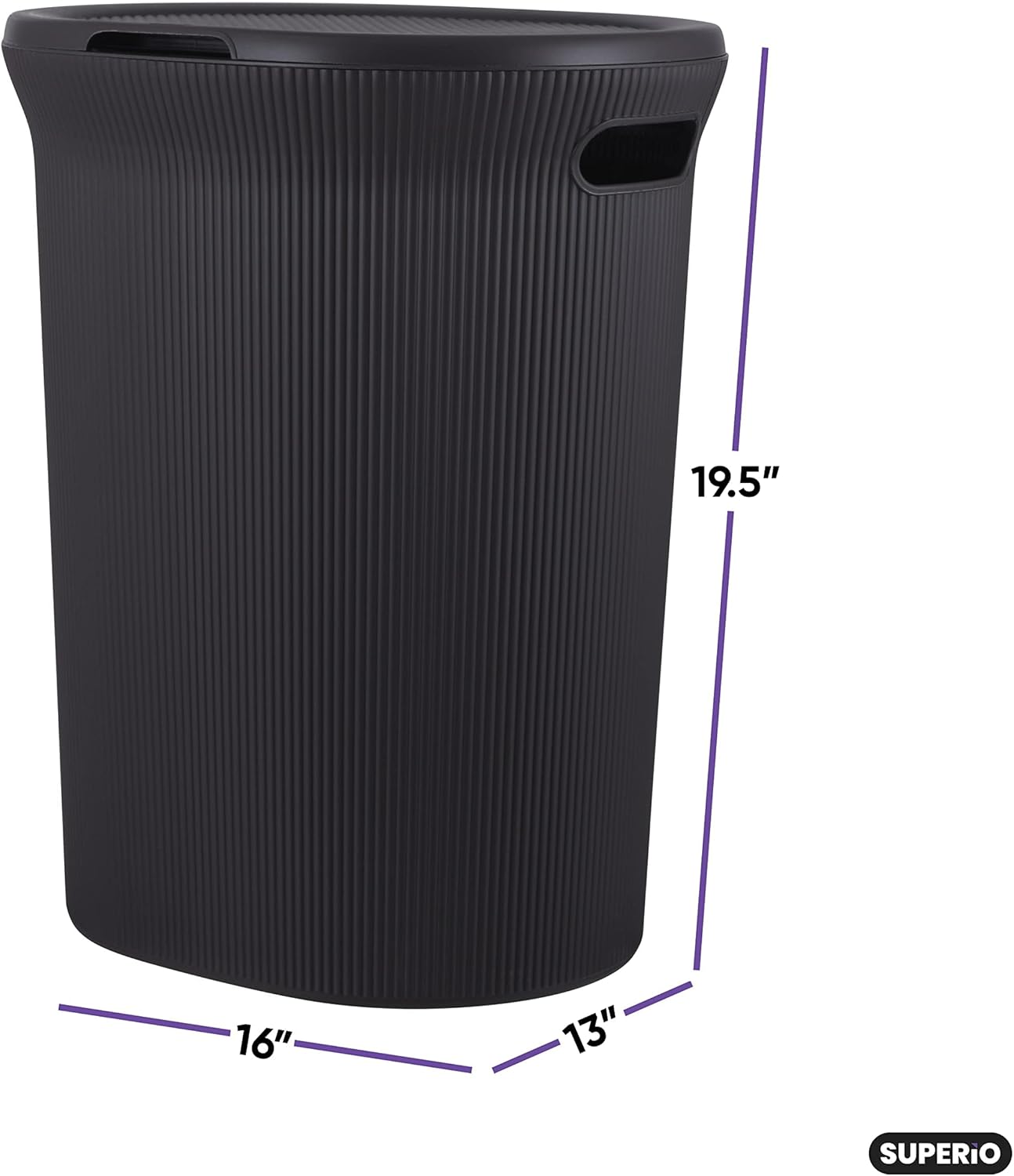 This superio laundry hamper is made to store dirty clothes, laundry or anything else you decide, its large size accommodates plenty of laundry. It offers a unique ribbed design and is well-constructed to handle heavy loads. Make laundry time less of a chore with this lightweight yet durable plastic hamper with lid. The dimensions are: 16” (L), 13” (W), 19.5” (H).