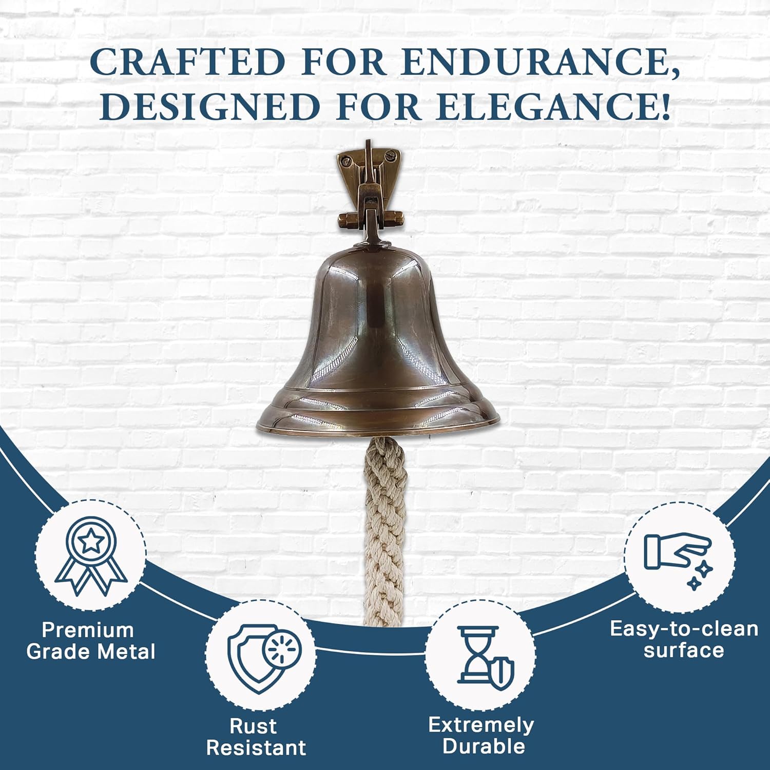 The bell comes with a wall mounting bracket so you can hang it in your kitchen (to have a fun way of calling the kids in for dinner), outside your door post, on your boat or dock, or anywhere else you'd like to have an alarm or clear ringing fun sound. Bell is finished in a polished brass coat that is shiny and looks great. Rings out clear note do not sound like just clanging metal, sounds like a real ship bell. The knotted rope is securely attached to give an easy and pleasant sounding note with every strike. This wall hanging bell can be used as dinner bell, school bell, boxing bell, church bell, or fire bell. Whatever your need we have your bell needs covered. It works great as an announcement bell in any situation whether you hit a PR at a gym or adopt a new pet you will feel a strong sense of pride ringing our nautical bell. Long lasting durability even when exposed to the elements. Ships with aged look on the inside to make it look like a real navy bell that was used. Whether you use it as a welcome doorbell on your porch or on your patio to let your guests know dinner is served, the delightful sound of this doorbell will ring loud and clear. This boat bell can be used in both indoor and outdoor.