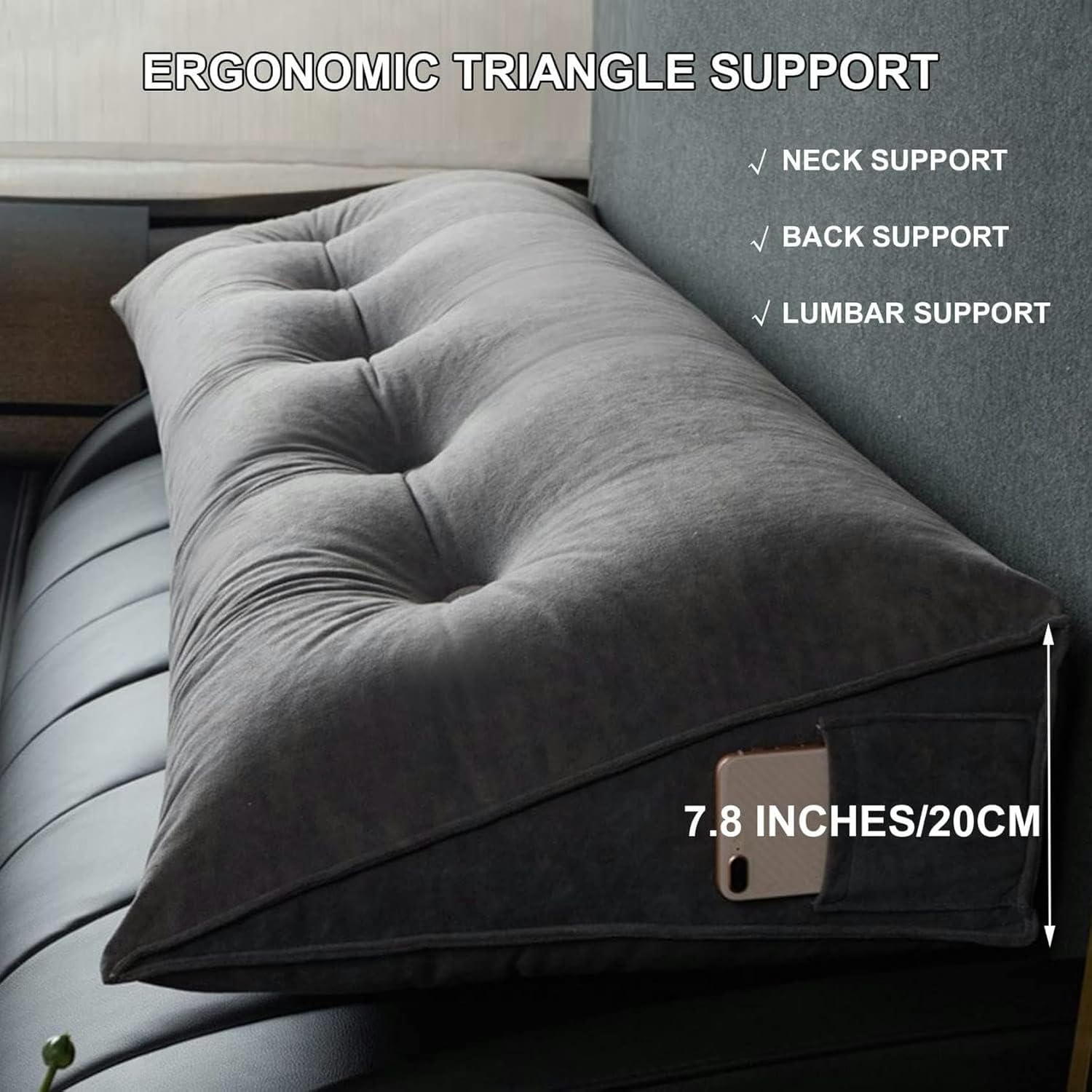 • [Ergonomic Reading Pillow]: Headboard cushion designed with positioning buckle can be well fixed on the lining to prevent damage to the backrest caused by long-term dependence. Triangular cushions support your back, neck and lumbar. Maintaining a correct posture while relaxing can help reduce pain. The thickness of 7.8 inches(20cm) can make the cushion provide better support for a long time. Don't worry about the cushion collapse.