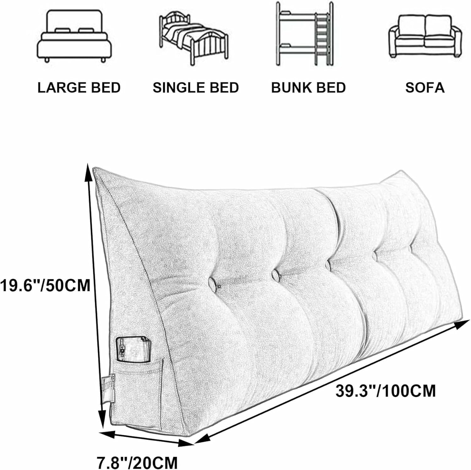 If you are looking for a comfortable headboard, take a look at the headboard with a modern design, you don't need to spend a lot of money to buy this comfortable large headboard cushion for a new upgrade to an old headboard. Bed The softness and comfort of the cushion can relieve pain in the waist, back and neck, thus providing you with a comfortable resting environment.Product Name: Triangle CushionSurface material: fleece fabricFilling: cotton fillingApplicable people: adults and childrenWashing method: Machine washThickness: 7.8 inch/20cmshape: wedgeType: sofa pillow, backrest pillow, leg lift pillow, knee pillow, bedside wedge pillow, pregnant woman support pillow, rest pillow, etc.Installation method: direct installationApplications: Bedroom, bedside, sofa cushion, bay window, tatami, anywhere you can rely on.Dimensions (width x height x thickness):100x20x50cm/39.3x7.8x20",120x20x50cm/47.2x7.8x20",150x20x50cm/59x7.8x20",180x20x50cm/70.8x7.8x20",200x20x50cm/78.7x7.8x20"Package Included:1x triangular support cushionNotice:1. If you have any questions during the purchase process, you can contact me at any time, and I will help you solve the problem as soon as possible.2. Please note that we ship this product by vacuum packing. Therefore, it will take a few days to return to normal thickness after opening the package.
