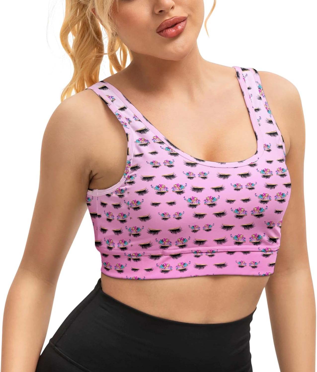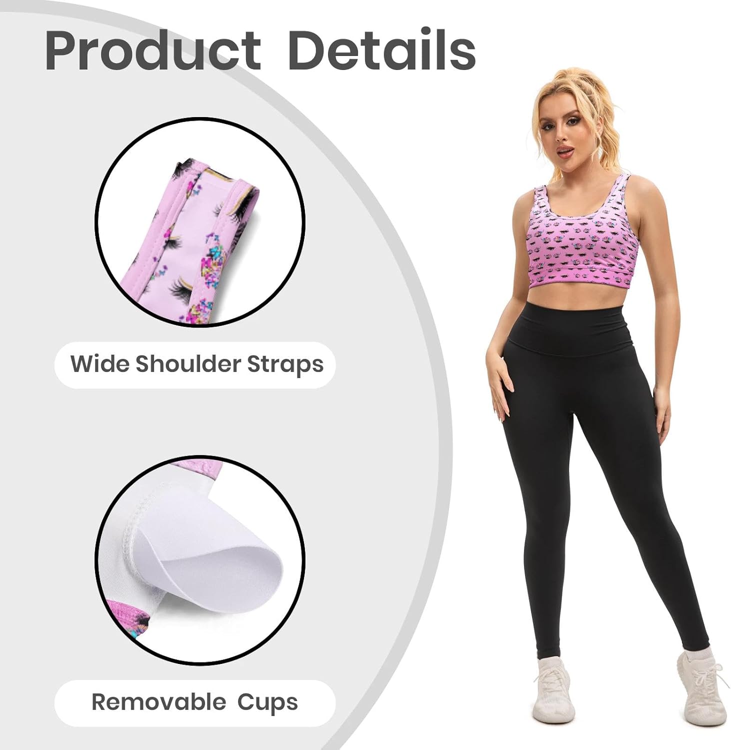 Women's camisole 95% polyester + 5% spandex, breathable with sweat wicking function.no steel ring, with chest pad.chest pad with detachable padding, internal chest strap is stable, designed to provide excellent support for cups. Not easy to shrink, durable.Ladies' sports vest does not have steel rims. Its chest pad is designed to be detachable to meet your daily needs.The shoulder straps of women's sports vests (including chest pads) are adjustable elastic straps, and women's special sports bras are durable.Size ----------- length (cm / in) ------- 1 / 2 bust (cm / in) ------- 1 / 2 hem (cm / in)S----------------29/11.4--------------37/14.6-----------------32/12.6M----------------30/11.8--------------39.5/15.6--------------34.5/13.6L-----------------31/12.2--------------42/16.5----------------37/14.6XL---------------32/12.6--------------44.5/17.5--------------39.5/15.62 XL-------------33/13----------------47/18.5-----------------42/16.5Please choose the size that suits you according to the size code Summer trendy tops are both stylish, functional and performance. Let you become the beautiful scenery of the street, highlight your figure.This Yoga Bra Combine Fashion, Function And Performance. This Tank Top Is Perfect For Yoga, Pilates, Running, Biking, Boxing, Bowling, Tennis, Dance, Sports, Tenis, Fitness And Any Other Types Of Exercises And Workouts, This Sports Bra & Tank Top Shirt Also Makes A Great Choice For Everyday Bra.Washing method: hand wash or machine wash, the temperature of the washing liquid should not exceed 45℃.After washing, it can be dried naturally,Remember never to use bleach, so as not to affect the aesthetic effect of the product.If you have your favorite pattern, you can also contact me for customization.