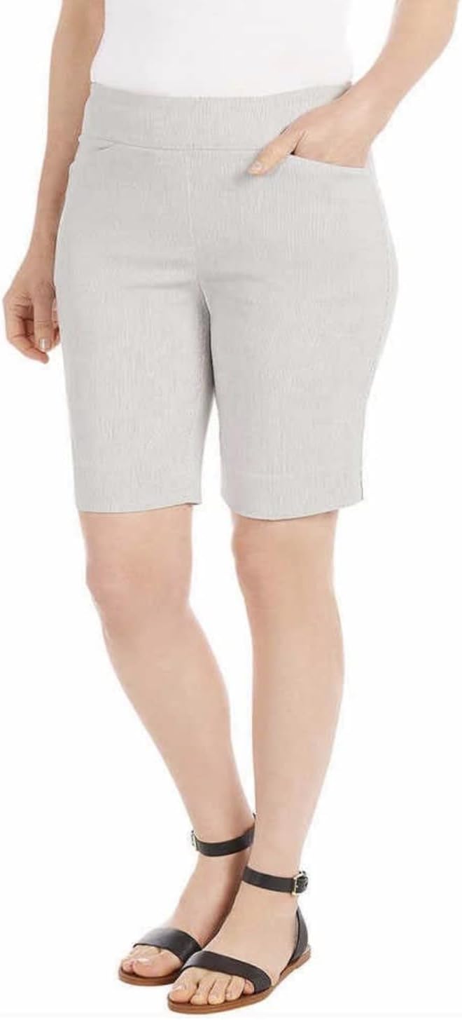 The essential style for summer: these effortless pull-on Bermuda shorts from Hilary Radley.Sizing: Size Conversion: X-Small = 2 | Small = 4-6 | Medium = 8-10 | Large = 12-14 | X-Large = 16 | XX-Large = 18 | 2X-Large = 20 Inseam (in): 9” Model is 5’7” wearing size Small Model is 5’9” wearing size Large Model is 5’8” wearing size 2XContent Black: 76% Rayon | 20% Nylon | 4% Spandex Heather Beige: 76% Rayon | 21% Nylon | 3% Spandex Off-White & Gray: 77% Rayon | 20% Nylon | 3% Spandex Light Blue Combo: 74% Rayon | 23% Nylon | 3% Spandex
