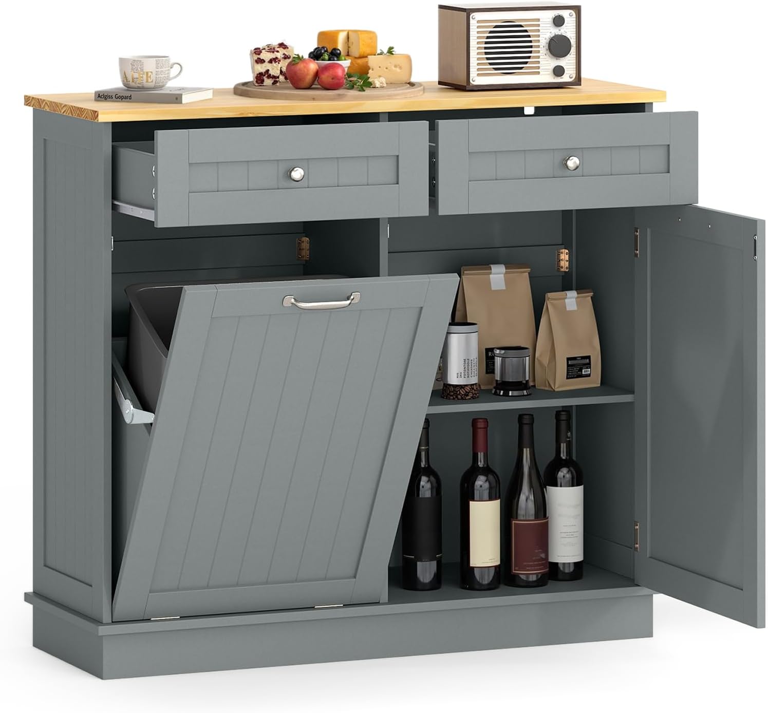 Description: No garbage emits odor any more. The tilt-out trash cabinet with 15.5-gallon capacity makes your kitchen look cleaner and tidier. It offers classified storage solution to keep your space organized and neat, thanks to the wide cabinet top, deep drawers, and a door cabinet with adjustable shelf, perfect for storing various items efficiently. With stable frame and rubber wood top, this cabinet is excellent in sturdiness and load-bearing for prolonged life. The deep drawer with metal handles and smooth slides ensures convenient usage. Anti-toppling device enable the using safety to be enhanced further. A multi-functional and decorative storage cabinet add some character to your home style! Features: 15.5-gallon tilts out hidden garbage holder blocks the odor from emanating Classified storage space meets your different storage needs 3-position adjustable shelf of 1.6” to fit items of different sizes Deep drawers with smooth metal handles and slides for great practicality Anti-toppling device is installed for added security Sturdy structure with rubber wood top for durability Door with magnetic catch for convenience Suitable to be used as a kitchen trash bin cabinet, a laundry basket, a recycle bin, etc. Elegant design blends seamlessly with any home style Specifications: Color: Black/ Brown/Gray/White Material: MDF, Engineered Wood, Rubber Wood Product Size: 39.5” x 14” x 35.5” (L x W x H) Drawer Inner Dimension: 16.5” x 11.5” x 3.5”(L x W x H) Drawer Outer Dimension: 18” x 12.5” x 6”(L x W x H) Cabinet Door Size: 18” x 25”(W x H) Right Cabinet Depth: 12” (When the shelf is in the middle) Height of the Shelf: 12” Cabinet Base Dimensions: 38.5” x 13”(L x W) Dimensions of the Trash Can Holder: 18” x 12”(L x W) Max. Opening Angle: 30° Maximum Capacity of Cabinet Top: 110 lbs Net Weight: 66 lbs Package Includes: 1 x Tilt Out Trash Cabinet 1 x Instruction