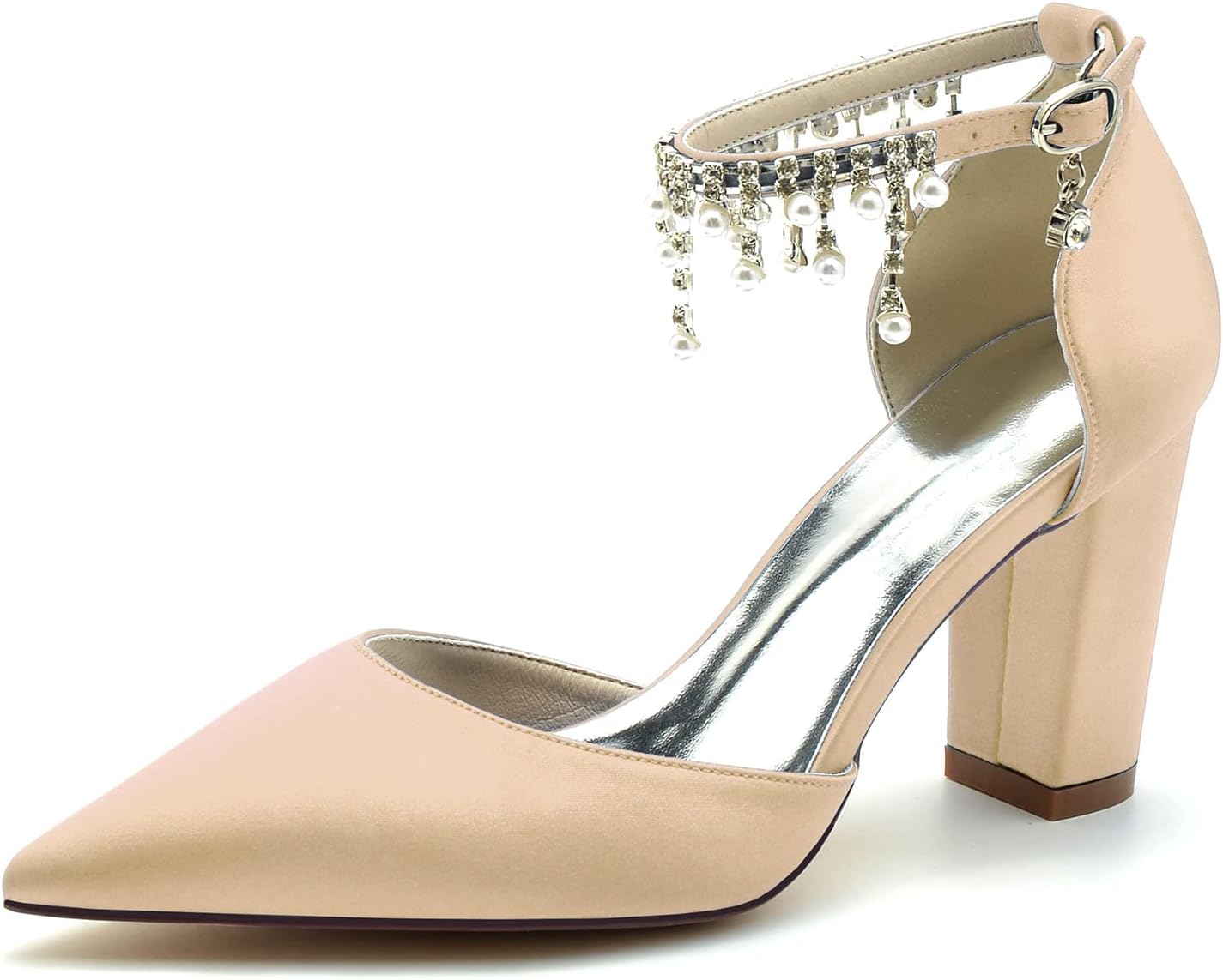 Welcome to our store.A striking block heel made from classic satin,our new shoes are perfect for those who love a high heel,they're incredibly comfortable! These stylish block heels are perfect to add a bold splash of colour to a wedding! Featuring pearls ankle straps for added style which keep your foot securely in place, you'll be able to dance all night in these beauties! Perfect for wedding, parties,cocktail Party, Graduation, homecoming and special occasions.Feature:Material: SatinLining: LeatherSole:RubberHeel Height: 8.5cmStyle: Pointed-toeSizes: US 6-11.5 (EU 36-43)Tips:Please choose size according to our size chart, our size chart maybe a little different from your standard size in your local place. The color may be a little different due to the effect of light and monitor setting.